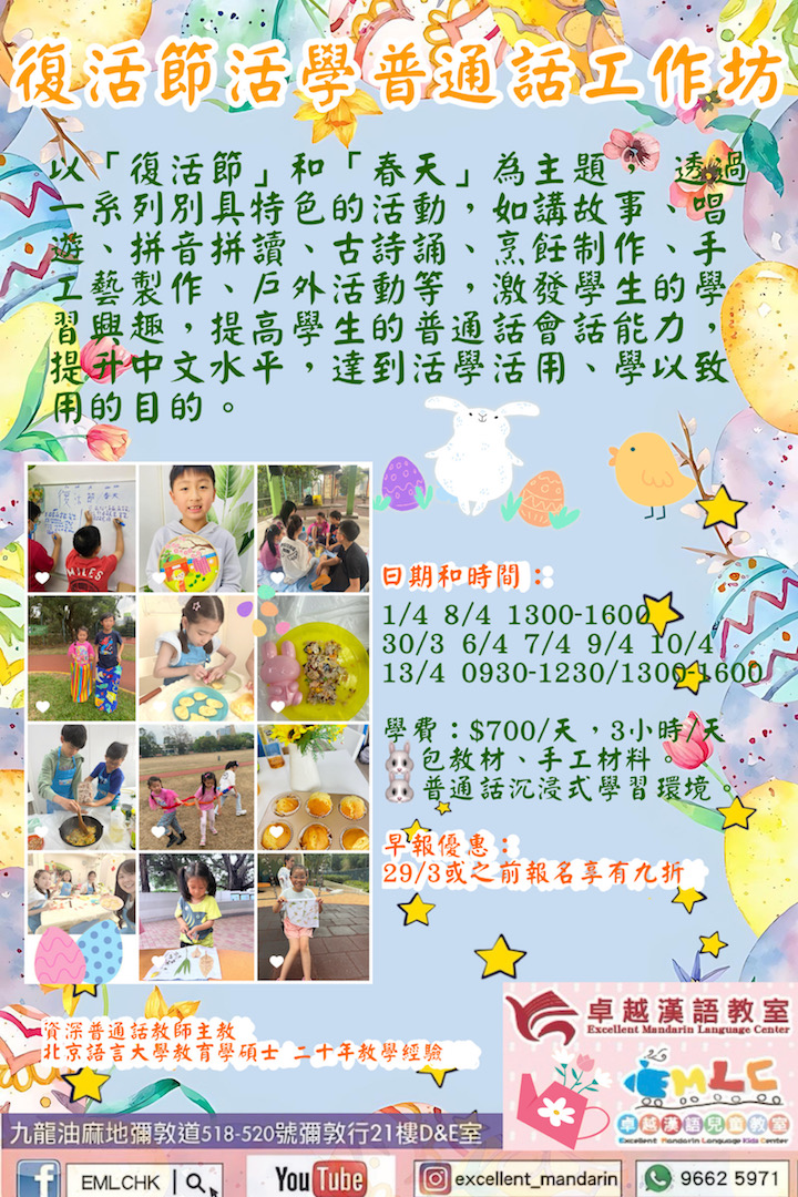 最新消息Tags: chinese, chineselanguage, easter, eastercamp, Easterworkshop, ExcellentMandarin, kidcourse, mandarin, mandarincourse, putonghua, 復活節, 復活節2023, 復活節營, 油麻地復活節, 油麻地普通話